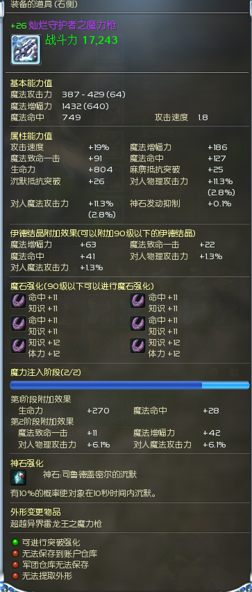 【武器强化神石魔石】:主手+26降级75 灿烂枪10沉默,副手+25降级75灿烂10沉默