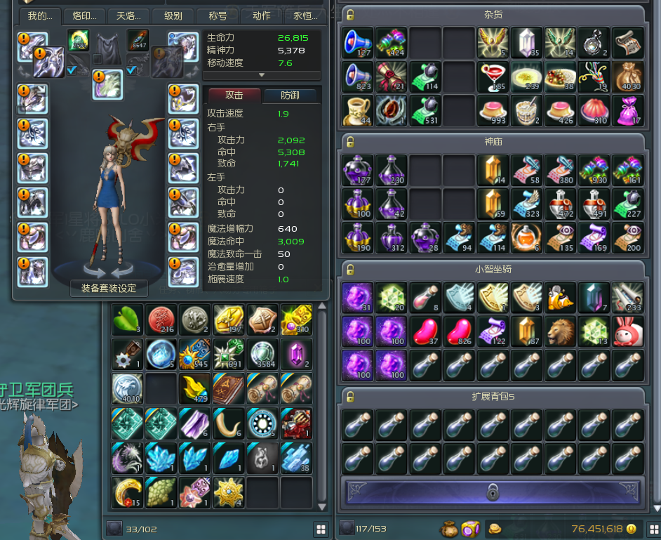 【额外东西】:守护者们公认的美女称号 闪耀大师还有几十个 神庙几十个 主神四组半 腰子800+ 轰隆隆小摩托车 同账号下 75级杀星一个 +15帕鲁夏 防具 增强短刀和长剑 全身14个力量12 其他全部力命10复合